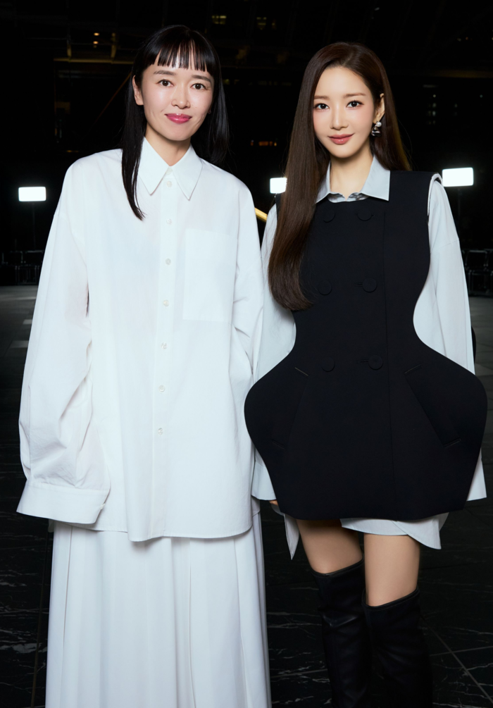 박민영은 블랙 베스트와 페일 그레이 셔츠를 레이어링한 미니 드레스 룩으로 등장해 브랜드가 지향하는 미니멀한 라인을 세련되게 구현했다.