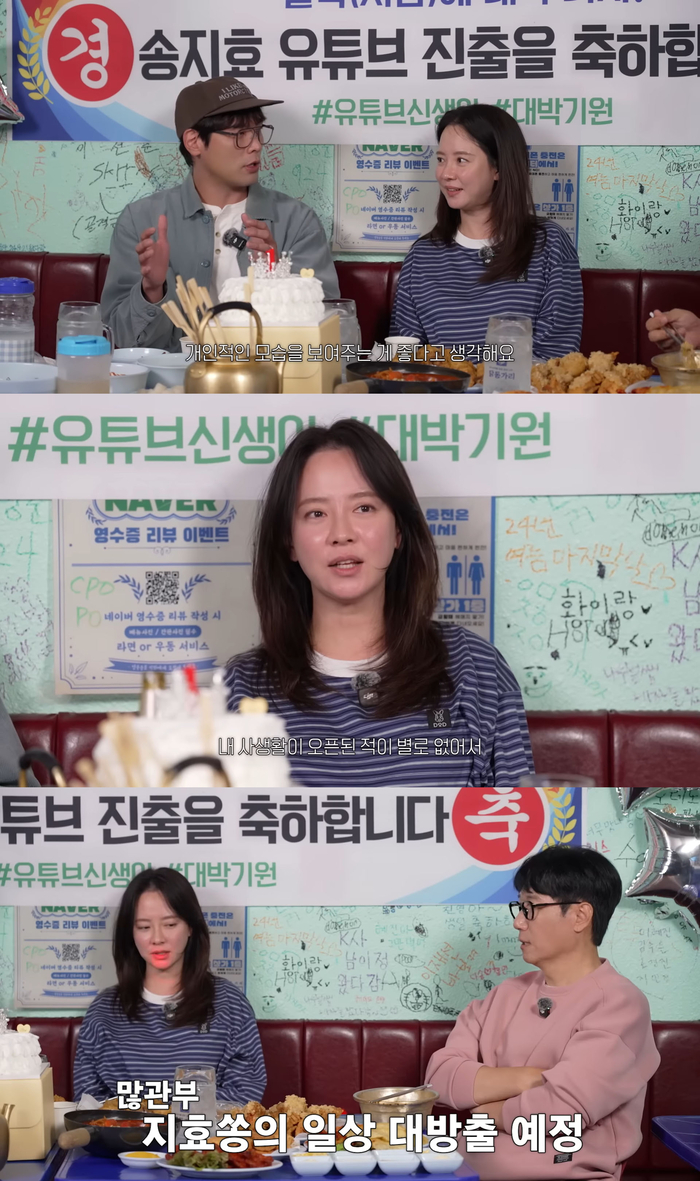 6일 해당 유튜브 채널에 공개된 영상에는 송지효의 채널 론칭을 축하하기 위해 지석진과 최다니엘이 게스트로 출연해 채널 콘셉트에 대한 진솔한 조언을 나누었다. 이 과정에서 최다니엘과 지석진은 송지효가 그동안 예능이나 드라마를 통해 보여주지 않은 개인적인 모습과 사생활에 집중해야 한다고 입을 모았다.