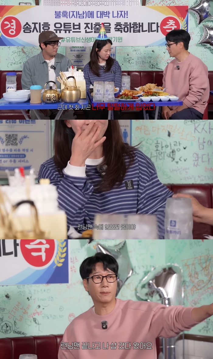 6일 공개된 송지효의 유튜브 영상에는 절친한 동료 지석진, 최다니엘이 게스트로 출연해 축하와 조언을 건넸다. 이날 지석진은 첫 유튜브 방송임에도 불구하고 너무 수수한 차림으로 나타난 송지효의 패션을 보고 즉각적으로 ‘타박’해 폭소를 안겼다.