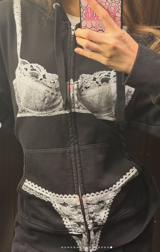 리사는 블랙 집업 후드를 입은 셀카를 공개했는데, 상·하의 부분에 언더웨어 실루엣이 프린트된 위트 있는 디자인이다. 마치 일러스트 속 의상을 걸친 듯한 독특한 연출이다.