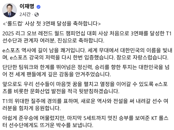이 대통령은 10일 자신의 SNS를 통해 “2025 리그 오브 레전드 월드 챔피언십 대회 사상 처음으로 3연패를 달성한 T1 선수단과 관계자 여러분, 진심으로 축하한다”라고 적었다.