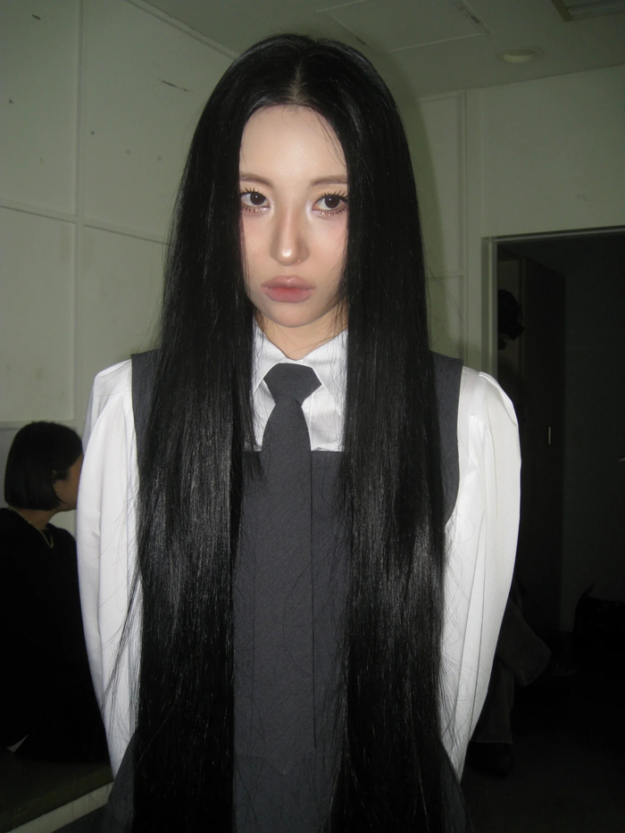 선미는 짧은 가죽 미니 원피스에 털 장식 코트를 걸쳐 퇴폐적인 카리스마를 발산했다. 특히 시선을 끄는 것은 그의 ‘말도 안 되는’ 각선미다. 높은 힐을 신은 그는 늘씬하게 쭉 뻗은 다리 라인을 과시하며 완벽한 비율을 자랑했다. 또 다른 사진에는 긴 생머리에 교복을 연상시키는 스타일로 ‘귀신’을 연출, 몽환적이면서도 괴기한 분위기를 만들어냈다.