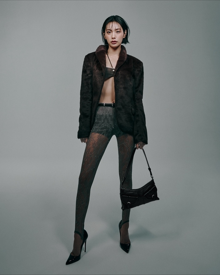 나나는 짙은 브라운 톤의 퍼 재킷 안에 브라톱을 걸쳐 탄탄하게 관리된 복근을 노출했다. 하의로는 시스루 패턴의 타이츠와 초미니 팬츠를 매치해 늘씬한 각선미를 부각하는 과감한 스타일링을 선보였다. 또한 다른 컷에서는 시스루 소재의 검은색 블라우스와 와이드 데님 팬츠를 착용하고 킬힐을 매치해 고혹적이면서도 힙한 매력을 발산했다.