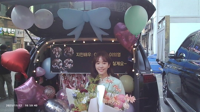공개된 사진 속 한지민은 ‘지민배우: Cut to 이의영, Ending 가실게요~’ 문구가 적힌 차 트렁크 이벤트 앞에서 환하게 웃고 있다.