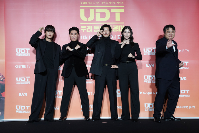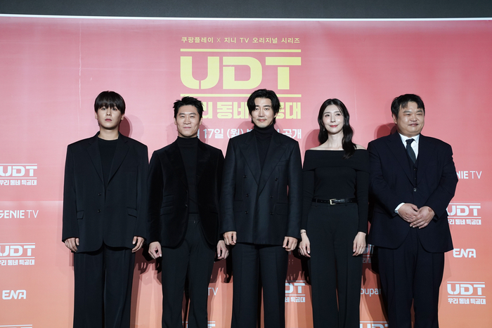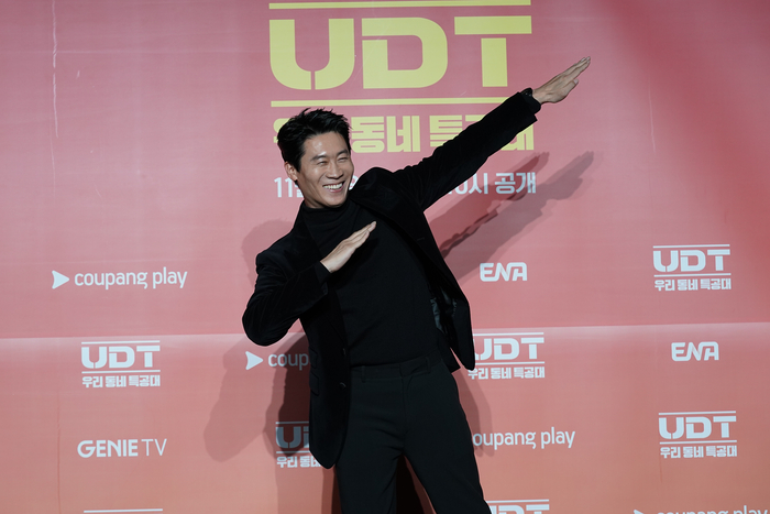 17일 서울 광진구 풀만 앰배서더 서울 이스트폴에서 열린 ENA 새 월화드라마 ‘UDT: 우리 동네 특공대’ 제작발표회에서 윤계상과 진선규는 서로를 보고 웃으며 “운명 같은 호흡”이라고 말했다. 진선규가 “소떡소떡 같은 사이”라고 비유하자, 옆에 앉은 윤계상이 “죄송하다. 이 분이 촌스럽다”고 대신 사과해 현장을 웃음바다로 만들었다.
