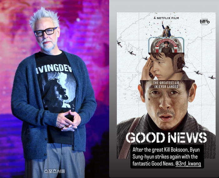 제임스 건 감독은 18일 자신의 SNS에 변성현 감독이 연출을 맡은 넷플릭스 오리지널 영화 ‘굿뉴스’ 포스터를 게재했다.