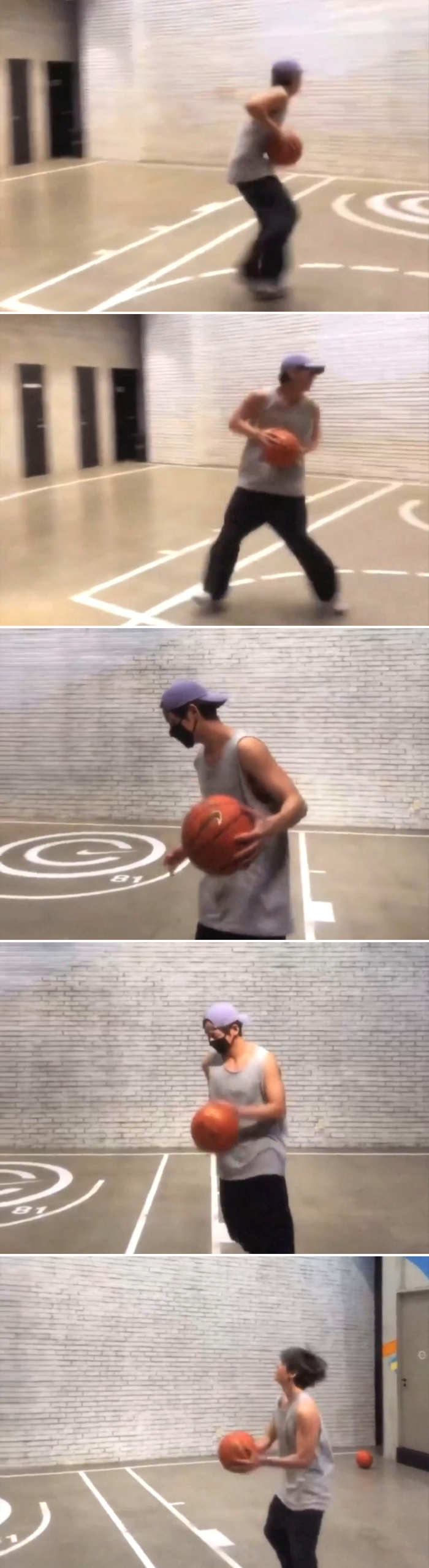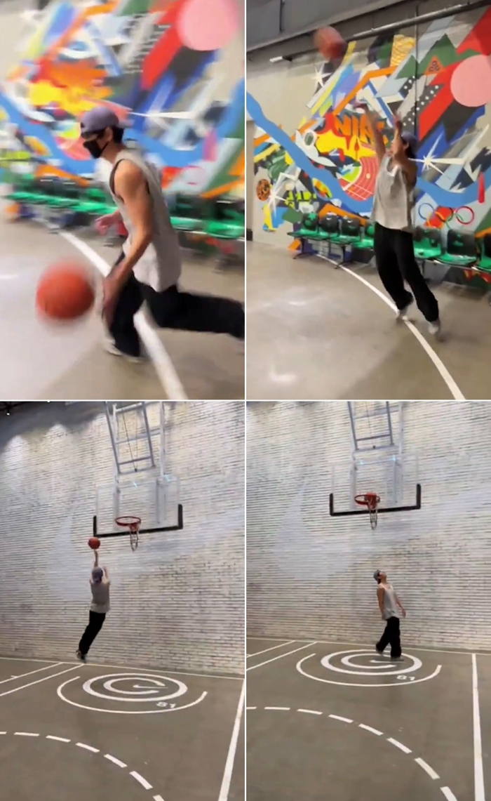 농구 선수를 연상시키는 큰 키와 긴 다리, 탄탄한 팔 근육이 그대로 드러났다. 상의를 벗은 뒤 곧바로 코트로 뛰어나가 손목 스냅을 이용해 가볍게 던진 레이업 슛을 깔끔하게 성공시키며 만능 스포츠맨다운 감각을 보여줬다. 드리블을 이어가는 모습은 마치 안무 연습을 하듯 부드럽고 유려했다.