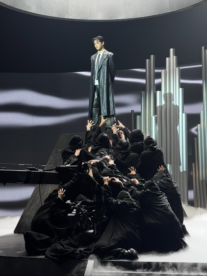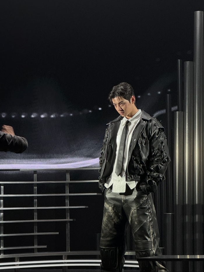 찢어진 듯한 디테일의 블랙 가죽 재킷과 팬츠, 그리고 헝클어진 헤어스타일, 상처 분장까지 더해져 강렬하고 반항적인 무드를 완성했다. 특히, 어두운 조명 아래 푸른빛이 감도는 클로즈업 컷에서는 만화 주인공 같은 퇴폐미가 폭발했다.