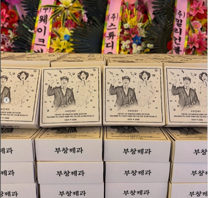 하객 답례품도 화제를 모았다. 이날 하객들에게 전달된 건 APEC 정상회의 협찬사로 이름을 알렸던 바로 그 호두과자 제품. 패키지 겉면에는 두 사람의 드로잉과 함께 “오늘 함께해 주신 따뜻한 마음에 대한 감사”라는 문구가 더해졌다. 답례품 하나에도 신랑의 기획력과 ‘부창제과’ 브랜드 색깔이 묻어 있다.