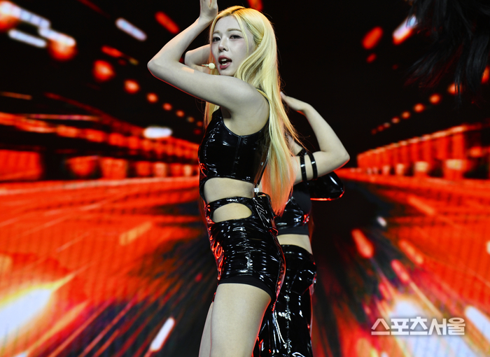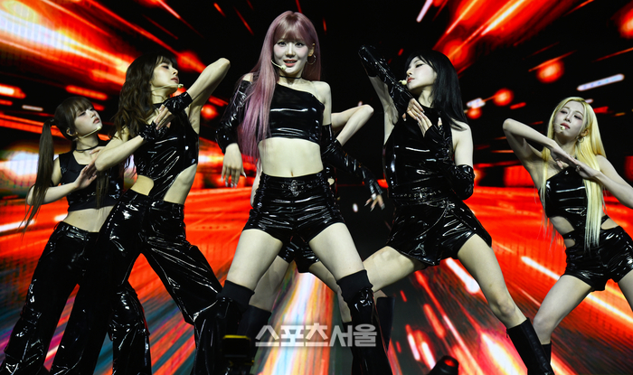페이턴트 베스트와 팬츠를 매치한 멤버들은 각각 다른 실루엣으로 변주를 더했다. 모든 멤버가 초커 네크리스를 착용해 Y2K 감성과 펑크 무드를 동시에 표현했으며, 블랙 니하이 부츠로 전체적인 통일감을 완성했다.