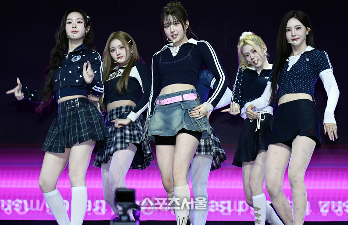 리더인 정하연은 네이비 화이트 트림 크롭 집업에 데님 미니스커트를 매치했다. 핑크 스터드 벨트로 포인트를 주었으며, 화이트 레이스 디테일이 페미닌한 무드를 더했다.
