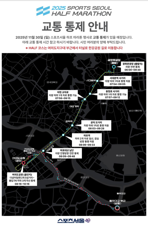 대회 개최에 따라 서울 도심 주요 구간에서는 오전 시간대 순차적인 교통 통제가 진행된다. 오전 6시부터 광화문광장 일대에 차량 통제가 시작되며, 이후 러너 이동에 맞춰 서대문역 사거리(07:54~09:05), 충정로 사거리(07:57~09:12), 아현 교차로(07:58~09:15), 공덕 오거리(08:03~09:28), 마포역(08:06~09:33), 마포대교 남단(08:09~09:48) 등 주요 지점이 통제된다.
