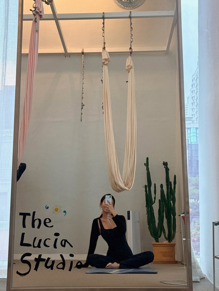 한 다리를 실크에 감아 공중으로 뻗은 채 균형을 잡는 장면부터, 몸 전체를 뒤로 젖혀 아치 형태를 만드는 포즈까지 여유로운 표정으로 소화해냈다. 마지막 사진에는 바닥에 앉아 스트레칭을 하며 거울을 통해 자연스럽게 셀카를 남긴 모습도 담겼다.