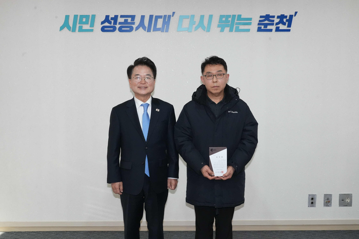 [스포츠서울ㅣ춘천=김기원기자]육동한 춘천시장은 28일 시청 접견실에서 중앙시장 화재 대응에 기여한 이성진 ㈜중앙시장 관리과장에게 표창패를 전달했다. 이성진 씨는 지난 11일 중앙시장 점포에서 화재가 발생했을 당시 신속한 초동 대응과 적정한 소방시설 관리로 대형화재 확산을 막는 데 기여했다.