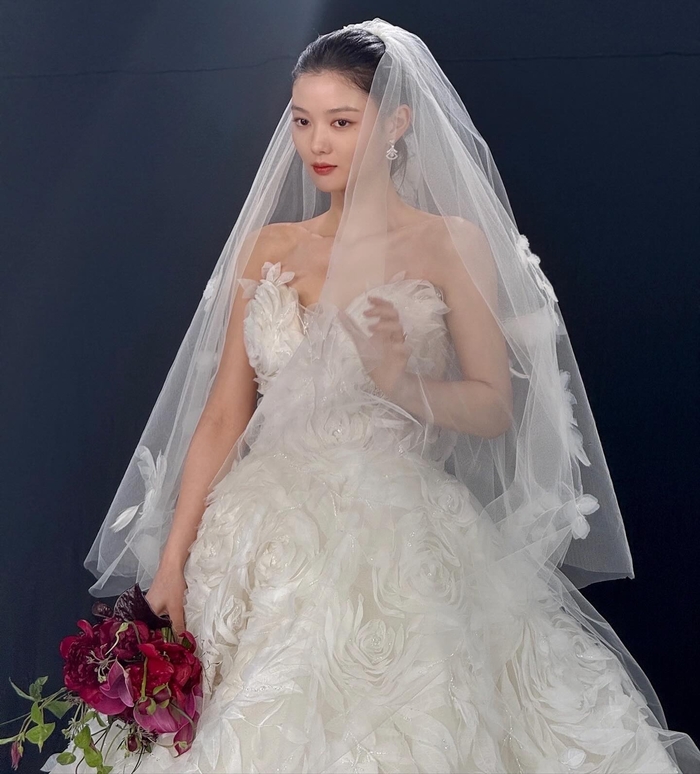 공개된 사진 속 김유정은 풍성한 프릴 디테일이 돋보이는 순백의 웨딩드레스를 입고 우아한 자태를 뽐내고 있다. 화려한 드레스와 대비되는 청초한 미모가 시선을 사로잡는다.