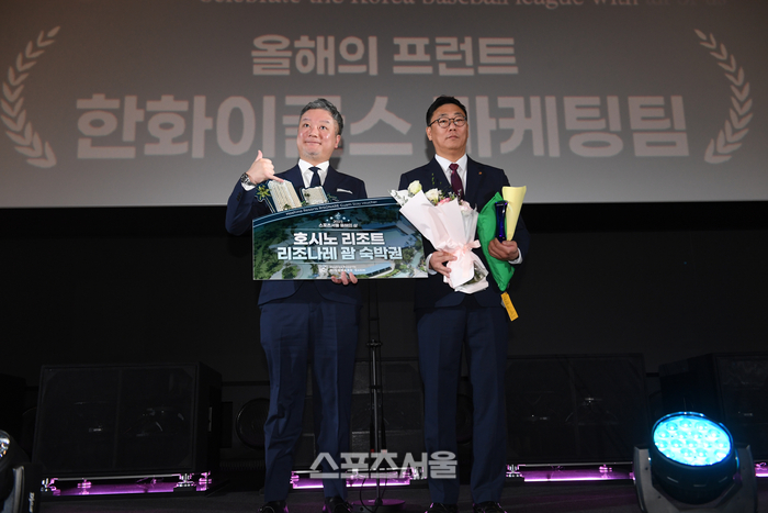 한화 이글스 마케팅팀 유종지 실장(오른쪽)이 4일 서울 영등포구 타임스퀘어 CGV 영등포 스크린X관에서 열린 ‘제39회 스포츠서울 올해의 상’에서 올해의 프런트상을 수상한 뒤 호시노리조트 괌 가토 도모히사 대표와 기념촬영을 하고 있다.