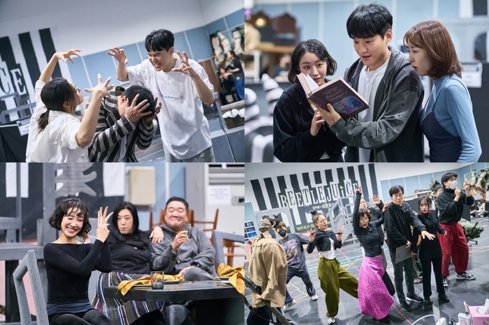 공개된 연습실 사진 속 배우들은 뜨거운 열기 속에서 각자의 배역으로 완벽히 변신, 캐릭터의 본질을 찾아가는 데 집중하는 모습이다. 특히 극의 중심을 이끄는 ‘비틀쥬스’ 트리오와 복잡한 내면을 가진 ‘리디아’ 듀오의 깊이 있는 연습 과정이 눈길을 끈다.
