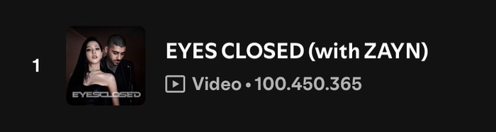 지수와 제인 말릭(ZAYN)의 협업곡 ‘EYES CLOSED’가 최근 글로벌 음원 플랫폼 스포티파이(Spotify)에서 누적 스트리밍 1억 회를 기록했다. 이는 지수의 전체 디스코그래피 7곡 중 네 번째로 달성한 기록이다.