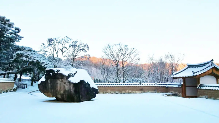 사유원의 겨울은 처절하리만치 아름답다. 특히 승효상이 설계한 ‘명정(瞑庭)’은 겨울 사색의 백미다. 붉은 코르텐강 벽 사이로 난 좁은 길을 따라 내려가면, 오직 하늘과 나무, 그리고 물소리만이 존재하는 침묵의 공간을 마주한다. 잎 떨어진 겨울나무 사이로 보이는 사유원의 풍경은 인간이 자연 앞에서 얼마나 작은 존재인지를 일깨운다.