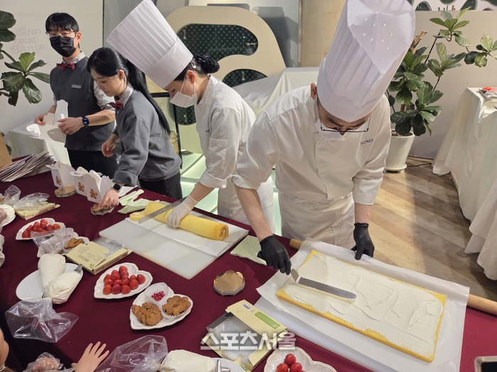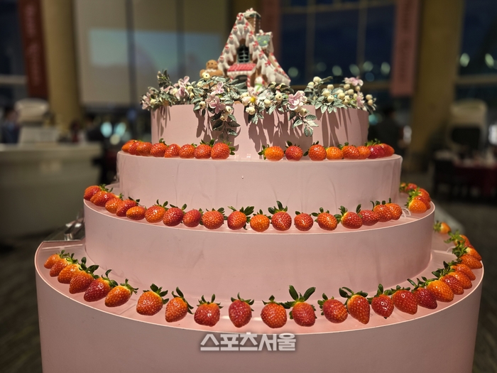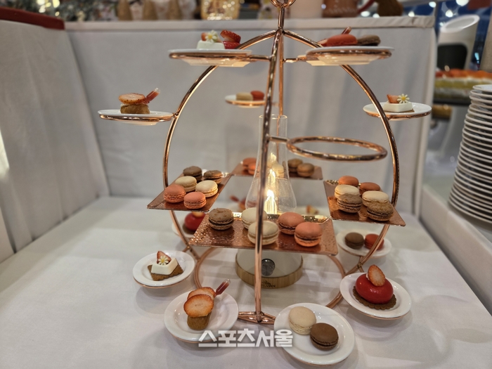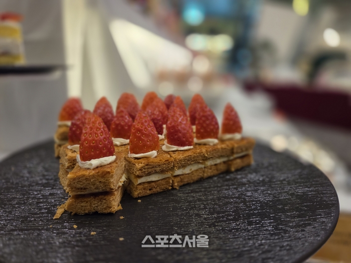 거친 호흡 뒤에는 달콤한 미각의 휴식이 필요하다. 소노펠리체 클럽하우스 ‘더 엠브로시아’에 들어서면, 딸기로 화려하게 장식된 거대한 3단 케이크 타워가 먼저 눈길을 사로잡는다. 이곳에서 펼쳐지는 ‘윈터 베리 키친’ 뷔페는 시각과 미각을 동시에 깨우는 예술 무대와 같다. 겨울 제철 딸기로 붉게 물든 타르트, 쁘띠 케이크, 마카롱 등 40여 종의 디저트가 보석처럼 빛나고, 한쪽에서는 셰프들이 즉석에서 신선한 크림을 발라 딸기 롤케이크를 완성하는 라이브 스테이션의 활기가 더해진다.