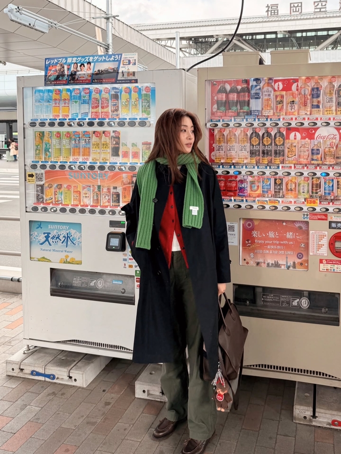 강소라는 강렬한 레드 카디건에 선명한 그린 컬러의 머플러로 스타일을 완성했다.