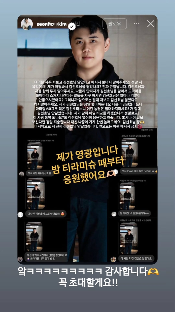 이에 배우 김선호가 직접 응답했다. 김선호는 이날 자신의 SNS에 권 셰프의 게시물을 공유하며 “제가 영광입니다. 밤 티라미슈 때부터 응원했어요”라고 따뜻한 화답을 보냈다. 권 셰프가 ‘흑백요리사’ 미션에서 선보여 신드롬을 일으켰던 메뉴를 직접 언급하며 ‘찐팬’임을 인증한 것.