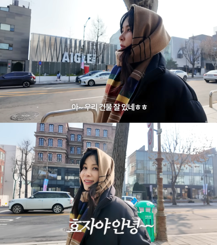그때 길 건너편 건물을 바라보며 “우리 건물 잘 있네”라고 말했다. 이어 “여기 건물 중에서 제일 예쁘지 않아? 약간 유럽 느낌의 디자인이 너무 예쁘다”며 “효자야 안녕”이라고 인사를 건넸다.