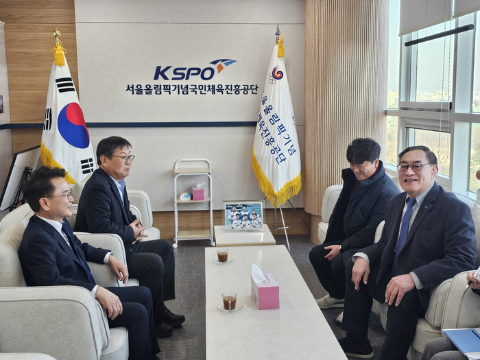 육동한 춘천시장은 27일 이강균 춘천시체육회장과 강성훈 강원대 교수와 함께 서울 올림픽회관에서 하형주 국민체육진흥공단 이사장을 만나 공연형 아레나 건립 사업과 관련한 춘천의 입지 여건과 유치 필요성을 설명했다. 앞서 육동한 시장은 지난해 5월에도 하 이사장과 면담을 하고 체육 인프라 확충에 대해 논의했었다.