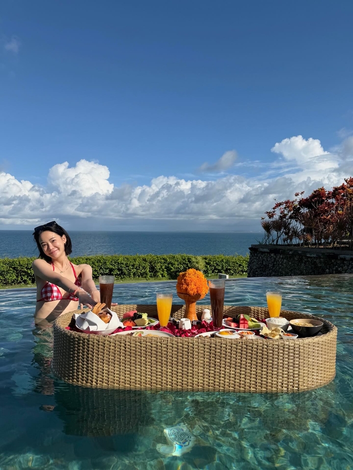 수영장 끝자락에 누워 에메랄드빛 물결과 하나가 된 듯한 포즈를 취하는가 하면, 최근 휴양지 트렌드인 ‘플로팅 조식’을 즐기며 럭셔리한 분위기를 연출하기도 했다. 맑은 하늘과 푸른 식물들이 어우러진 정원에서는 특유의 청순한 미소와 함께 장난기 넘치는 표정을 지어 보여 매력을 더했다.