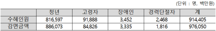 2024년 귀속 기준 중소기업 취업자 소득세 감면 제도의 수혜 인원은 총 91만 4405명이며, 감면 금액은 9760억 원 규모다. 이 중 청년은 81만 6597명으로 가장 큰 비중을 차지했고, 감면액은 8860억 원 수준이다. 고령자는 9만 1888명(848억 원), 장애인은 3452명(33억 원), 경력단절자는 2468명(18억 원이 각각 감면됐다.