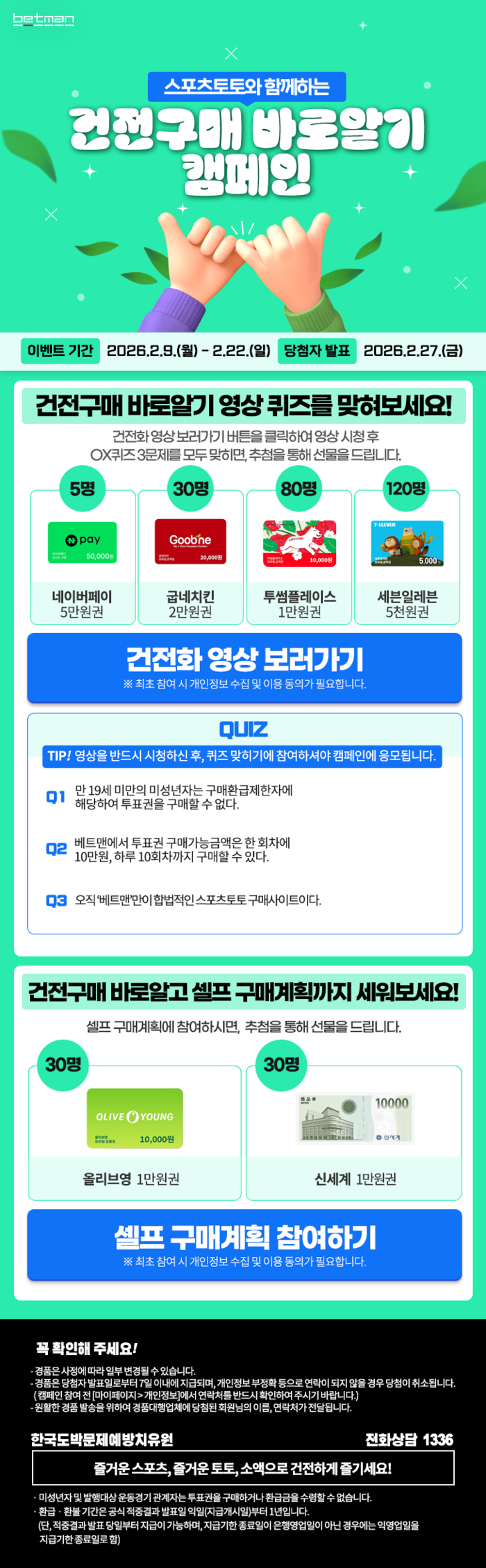 먼저 건전구매 바로알기 영상 퀴즈는 캠페인 영상 시청 후 제시되는 OX 퀴즈 3문항을 모두 맞힌 고객을 대상으로 추첨을 통해 경품을 제공한다. 당첨자는 네이버페이 5만 원권(5명), 굽네치킨 2만 원권(30명), 투썸플레이스 1만 원권(80명), 세븐일레븐 5천 원권(120명)을 받을 수 있다.