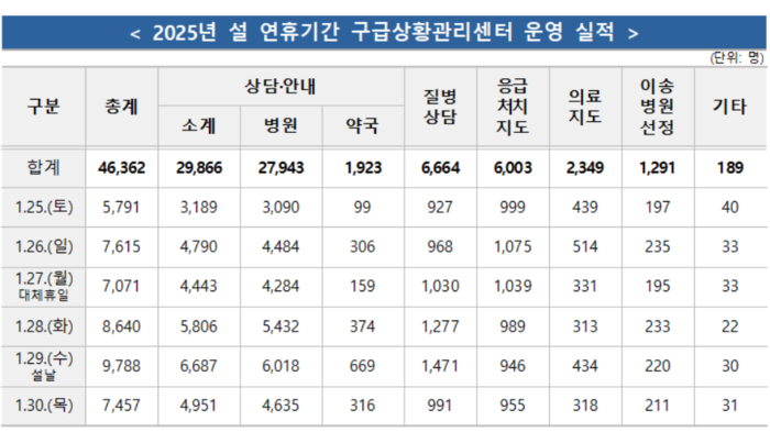 날짜별로는 설날 당일(29일) 상담 요청이 가장 많았으며, 내용별로는 병원 및 약국 안내(29,866건)가 전체의 64.4%를 차지해 가장 높았고, 질병 상담(6,664건)과 응급처치 지도(6,003건)가 그 뒤를 이었다.