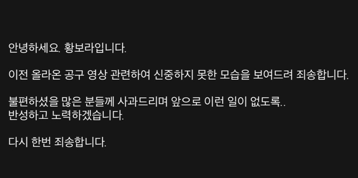논란이 걷잡을 수 없이 커지자 황보라는 13일 자신의 SNS를 통해 사과문을 올렸다. 그는 “이전 올라온 공구 영상 관련하여 신중하지 못한 모습을 보여드려 죄송합니다”라며 “불편하셨을 많은 분들께 사과드리며 앞으로 이런 일이 없도록 반성하고 노력하겠습니다”라고 고개를 숙였다. thunder@sportsseoul.com