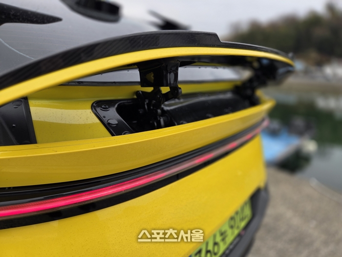 통영 산양면 일주도로 굽이진 해안길에서 감속과 가속을 반복할 때마다, 스포일러는 쉴 새 없이 움직이며 차의 밸런스를 맞춘다. 내가 운전하는 리듬에 맞춰 차가 함께 호흡하고 춤추는 느낌. 기계가 아닌 생물체와 교감하는 듯한 이 기분은 전기차 시대에 잃어버렸던 운전의 재미를 다시 일깨워준다.