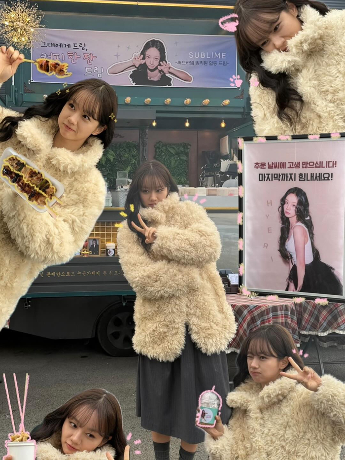 공개된 사진 속 혜리는 포근한 베이지색 ‘뽀글이’ 퍼 코트를 입고 인형 같은 비주얼을 뽐내고 있다. 특히 먹음직스러운 닭꼬치를 들고 한껏 기대에 찬 표정을 짓는가 하면, 입을 삐죽 내밀며 닭꼬치 맛에 감탄하는 모습은 보는 이들의 미소를 자아낸다.