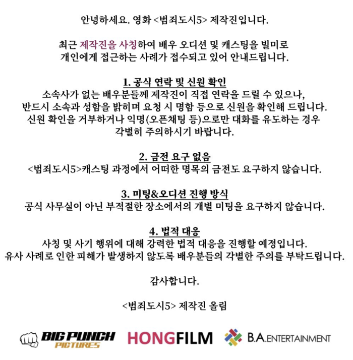 ‘범죄도시5’ 제작진은 지난4일 비에이엔터테인먼트 공식 SNS를 통해 “최근 제작진을 사칭하여 배우 오디션 및 캐스팅을 빌미로 개인에게 접근하는 사례가 접수되고 있다”는 내용의 메시지를 전했다.