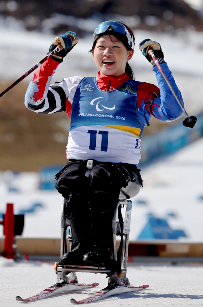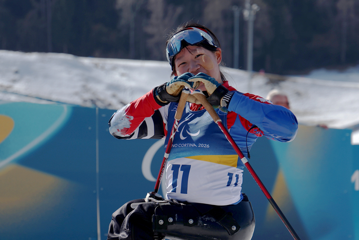 김윤지는 8일(현지시간) 이탈리아 테세로 크로스컨트리 스키 스타디움에서 열린 2026 밀라노·코르티나 동계패럴림픽 바이애슬론 여자 개인 좌식 12.5㎞ 경기에서 38분00초01의 기록으로 금메달을 목에 걸었다.