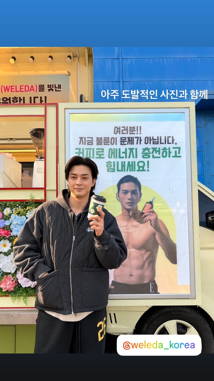 김지훈도 이날 자신이 모델로 활동 중인 브랜드에서 보내준 커피차 앞에서 인증샷을 남겼다.