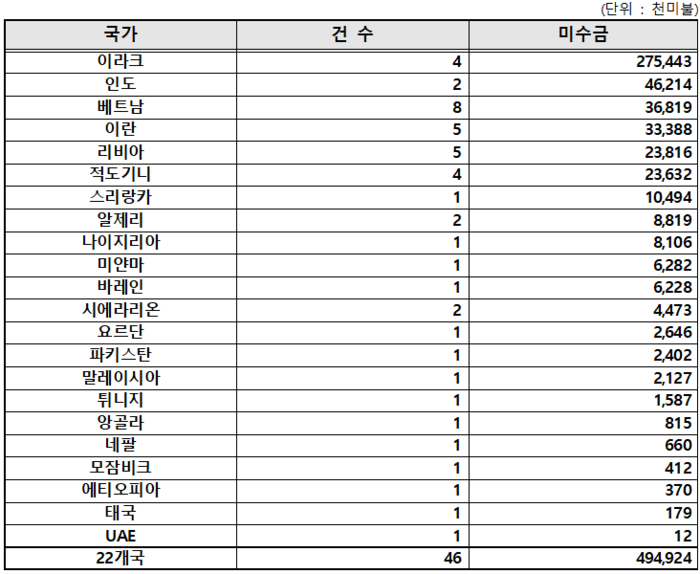문제는 해외 건설공사 장기 미수금 중 절반 가까이인 약 2억 1003만 달러(약 3090억원)가 5년 이상 받지 못한 ‘악성 미수금’이라는 것이다. 특히 이 중 미수금 1천만 달러 이상 사업의 대부분이 이라크, 이란 등 중동 지역 사업이었다.
