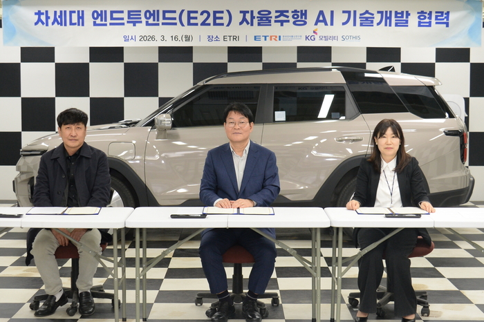 [스포츠서울 | 김미영 기자] KG 모빌리티(KGM)가 자율주행 AI 기술 개발을 위해 한국전자통신연구원(ETRI) 및 자율주행 기업 주식회사 소디스와 기술 협약(LOI·Letter Of Intent)을 체결했다고 17일 밝혔다.