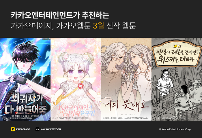 [스포츠서울 | 표권향 기자] 카카오엔터테인먼트가 인기 웹소설을 각색한 노블코믹스와 플랫폼 대표 스타 작가들의 웹툰으로 구성한 3월 카카오페이지·카카오웹툰 화제의 신작 웹툰 4종을 공개했다.