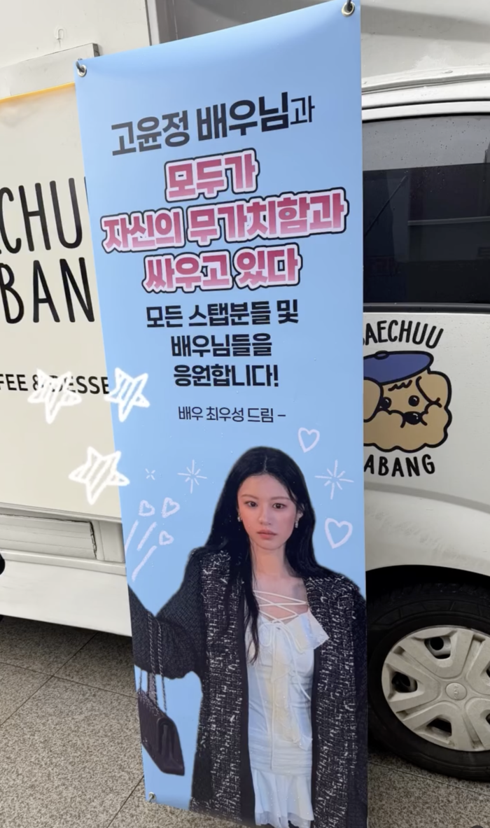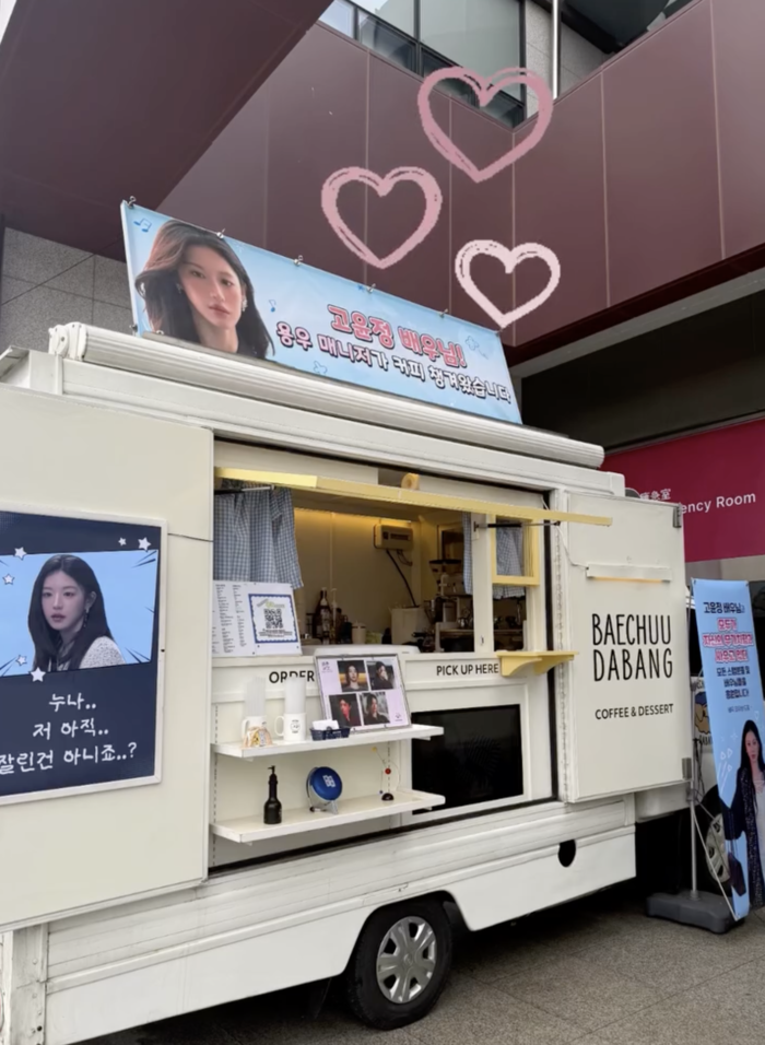 공개된 사진 속 커피차에는 “고윤정 배우님! 용우 매니저가 커피 챙겨왔습니다”라는 문구가 적힌 대형 현수막이 걸려 있어 눈길을 끌었다.