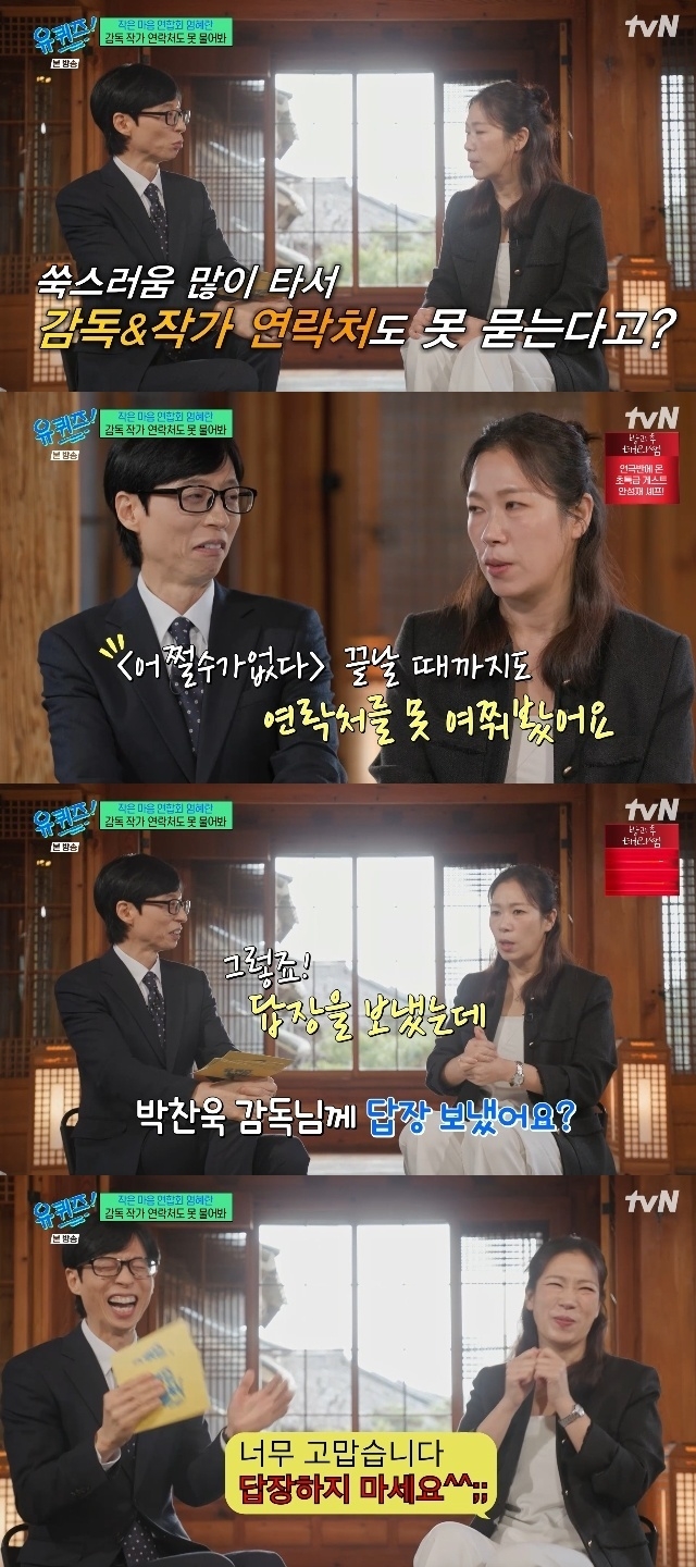 전날인 18일 방송된 tvN ‘유 퀴즈 온 더 블럭’에서 염혜란은 ‘어쩔수가없다’ 후속작 촬영 중에 문자를 한 통 받고 놀라서 벌떡 일어나게 됐다고 전했다. 발신인은 박찬욱 감독이었다. 박찬욱 감독은 “첫 촬영 축하. 가까운 일산서 편집하면서 매일 얼굴 보고 있다”고 안부를 전한 것.