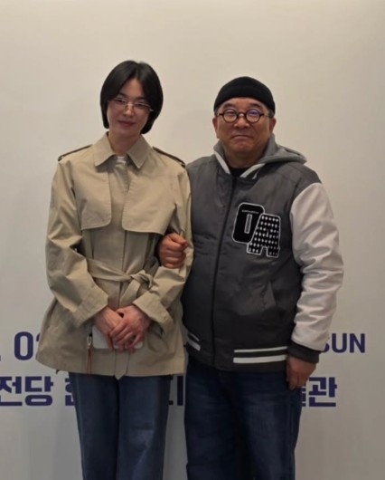 공개된 사진 속 송혜교는 김수철의 전시 ‘소리그림’을 찾아 작품을 감상하고 있다. 두 사람은 팔짱을 끼고 사진을 찍으며 다정한 분위기를 연출했다. 작품 설명을 듣는 송혜교의 모습도 함께 담겼다.