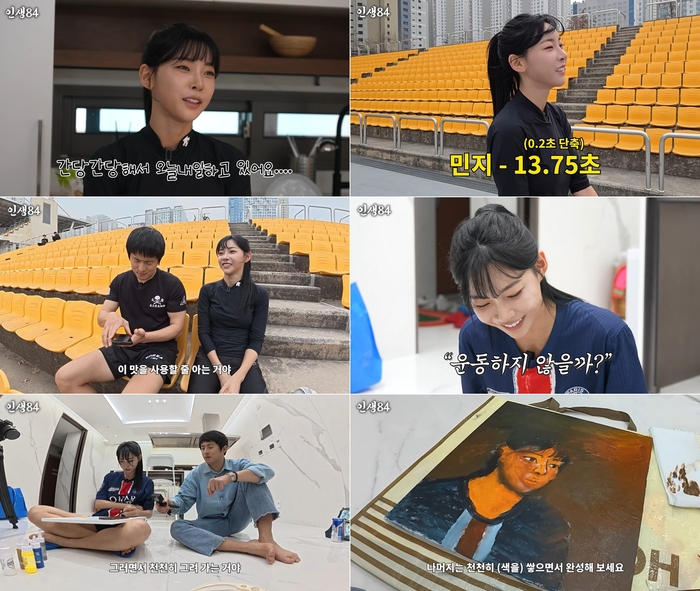 김민지는 6일 공개된 유튜브 채널 ‘인생84’에서 기안84(본명 김희민)와 함께 트랙 위에서 100m 달리기 승부를 펼쳤다. 컨디션이 좋지 않은 상태에서도 기안84를 앞서며 운동선수 출신다운 기량을 뽐냈다.
