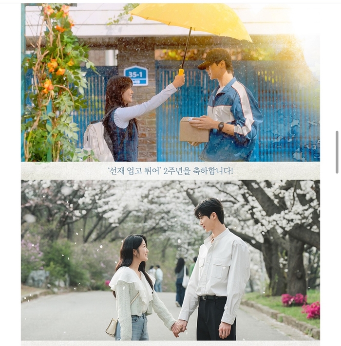 사진에는 선재 역의 변우석과 솔 역의 김혜윤이 달달하게 눈을 마주하는 장면이 담겼다. 또한 “‘선재 업고 튀어’ 2주년을 축하합니다!”, “변우석♥김혜윤”이라는 문구가 더해져 팬들의 설렘을 자극했다.