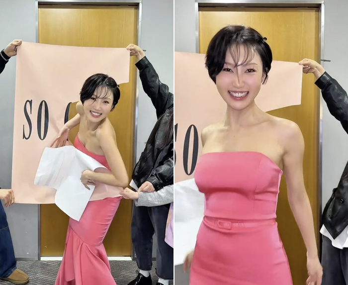 공개된 영상 속 화사는 분홍색 튜브톱 드레스로 ‘So Cute’가 적힌 종이를 찢는 과감한 동작으로 등장해 환한 미소를 보이고 있다.