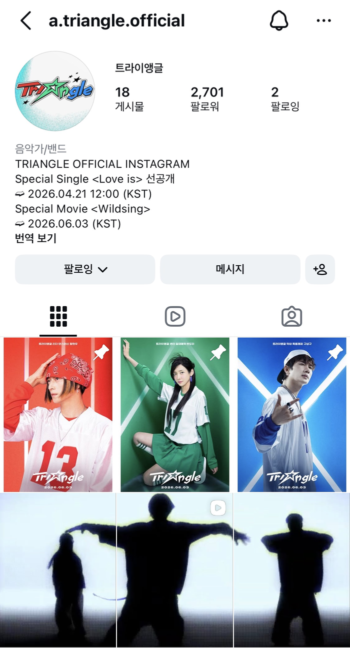 특히 ‘트라이앵글’의 데뷔곡 ‘러브 이즈(Love is)’ 일부가 선공개되며 실제 가수 못지않은 비주얼과 완성도로 커뮤니티와 SNS에서 뜨거운 화제를 모았다. 여기에 ‘트라이앵글’의 공식 SNS 계정과 나무위키 페이지가 오픈되며 예비 관객들의 과몰입을 유발하고 있다. sjay0928@sportsseoul.com