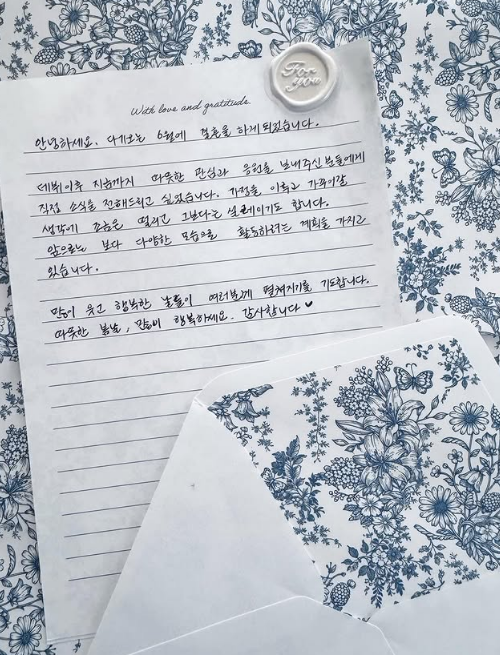 데뷔 이후 지금까지 따뜻한 관심과 응원을 보내주신 분들에게 직접 소식을 전해드리고 싶었습니다. 가정을 이루고 가꾸어 갈 생각에 조금은 떨리고, 그보다는 설레이기도 합니다. 앞으로는 보다 다양한 모습으로 활동하려는 계획을 가지고 있습니다.