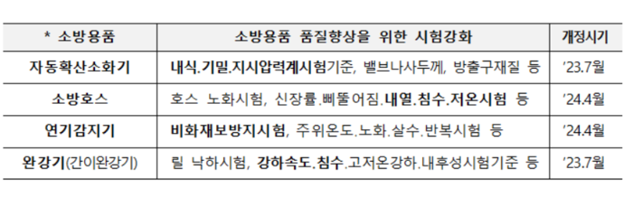 아울러 소방청은 소방용품의 품질을 향상시키기 위해, 기존의 시험 기준을 대폭 강화하거나 새롭게 신설하여 소방용품*의 고품질화를 이뤄냈다. 이를 건물 관계인에게 적극적으로 안내하여 자율적인 교체 분위기를 조성할 방침이다.